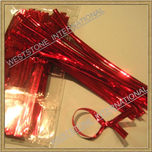 Material: Metallic** Color: Red** Length: 4" (10cm)** Width: 5/32"** Wire Gauge: 27** Packing: 100pcs/bag** ----------------------------- Limited Special Offer: 600pcs mixed color of 4" twist ties, 100pcs of each Gold, Red, Green, Silver, Pink and Blue. <$9.98 with extra 5% off and shipping free>. Please check our store or search ASIN# B005CW4QM4.)